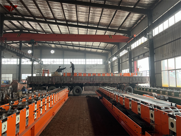 2. 生产时将压瓦机设备要加工的彩钢板材由托架放在压瓦滚轮之间,启动动力系统使电机带动链轮,链轮带动压瓦滚轮来进行成型彩钢板,通过数个成型滚轮转动并依靠摩擦力带动型钢平稳缓慢前行,同时逐渐压制形成设计所需弧度。