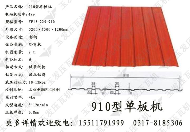 910单板压瓦机设备主要由放料机,进料导入平台,成型主机,成型剪切装置,液压站,电脑控制系统等几部分组成,所有配置零件均属玉发原厂配件,生产全过程实施质量监控,用户可放心选择。